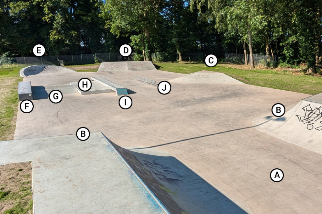 - Modern und vielseitig: Mit einer breiten Palette an Obstacles ist der Skatepark für alle Skater geeignet.